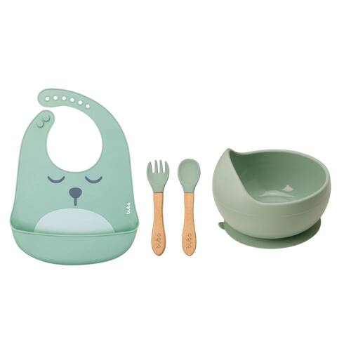 O Bowl em Silicone com Ventosa da Buba vai tornar as refeições do bebê muito mais práticas. Possui ventosa para fixar nas superfícies. Ideal para evitar que o pratinho escorregue durante a autoalimentação. O Kit Talheres Silicone e Bambu da Buba é super prático e higiênico. Possui um garfo e uma colher com ponta macia e flexível. ideal para as gengivas sensíveis do bebê, e cabo em bambu que é super leve. Perfeito para a alimentação dos pequenos. O Babador Gumy tem a base cata-migalhas que evita que o bebê se suje, mantendo o ambiente limpinho. Ele é 100% Silicone, com material macio, maleável e extremamente confortável. Além disso, ele tem o acabamento das bordas arredondado. Conjunto ideal para crianças a partir de 6 meses. Medidas (AxLxP): Prato: 20 x 20 x 3 cm. Bowl: 12 x 12 x 8 cm. Talheres: 14,5 x 3,5 x 1 cm. Composição: Babador 100% Silicone. Talheres: Cabo: 100% Bambu; Talheres: 100% Silicone. Conteúdo da embalagem: 1 babador, 1 bowl, 1 colher e 1 garfo.