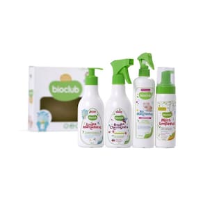 O Kit Box Saudável da Bioclub contém 4 produtos: 1 Roupa cheirosinha; 1 Limpa mamadeiras; 1 Mãos Limpinhas e 1 Xô Manchinhas.