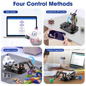 O braço conta com 4 servomotores digitais de alta precisão e oferece funções de memória de movimentos, transporte de objetos, paletização simples e criação de ações personalizadas, servindo como plataforma para exercícios de cinemática básica e robótica colaborativa. O controle pode ser feito por joystick físico, por interface web/app ACEBOTT ou via programação, com suporte a Arduino IDE, Python e programação gráfica em blocos (ACECode), e tutoriais detalhados que orientam desde a montagem até a criação de sequências de movimentos.