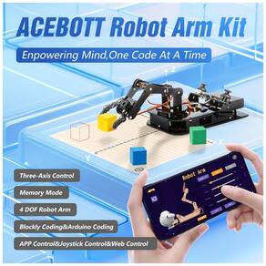 O braço robótico ACEBOTT QD022 é um kit de robótica educacional com 4 graus de liberdade baseado em uma placa controladora ESP32, indicado para iniciantes a partir de 8 anos e para uso em STEAM/robótica educacional. A estrutura foi projetada para simular o movimento de um braço humano, permitindo girar a base, mover “ombro” e “cotovelo” e abrir/fechar a garra para pegar objetos leves em diferentes direções.
