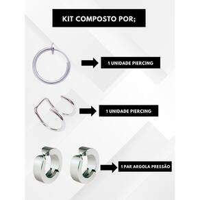 Kit brinco argola pressão prata piercing cartilagem encaixe garra aço inox - 4 peças Kit brinco argola pressão prata piercing cartilagem encaixe garra aço inox - 4 peças Kit brinco na cor aço inox prata é uma ótima opção para presentear um amigo ou namorado. Esse kit é bem completo, pois contém 2 peça do brinco de cartilagem e 2 peças 1 par do brinco pressão argola. Não precisa ter furo para usar - preço do kit com 4 peças - excelente qualidade ============================================== Fotos reais do produto na galeria Detalhes técnicos: Marca: visujóias Modelo: brinco pressão kit Diâmetro: 8mm Espessura do brinco: 4mm Incluso: 3 peças 2 peças 1 par de argola pressão e 2 peças brinco cartilagem . Material: aço inoxidável. : a tem prazo de 6 meses. Todas as peças possuem tratamento antialérgico. ============================================== P:minha compra é segura R:toda compra que é feita aqui está em ambiente seguro, isso significa que se caso ocorra algum imprevisto faremos o estorno de seu pagamento. R: sim. P: precisa de furo para usar O brinco fica caindo R: não não precisa de furo para usar. Colocando o brinco da maneira correta, não fica caindo, pelo contrario, fica bem fixo. Temos um vídeo na galeria explicando como usar. P: produto é a prova d'água R: sim, pode usar em piscinas e praias que não escurece. P: tem R: sim, todos os nossos produtos tem de 6 meses, contra defeitos de fabricação. Todas as informações de cuidados são enviados junto com o produto. P: posta em quanto tempo P: posso trocar se não servir R: sim, enviamos nosso contato junto com o produto para orientação sobre troca. P: posso devolver se não gostar R: sim, caso não goste do produto é só entrar em contato conosco que iremos orientá-lo como efetuar a devolução. Dúvidas Pergunte à vontade, estamos aqui. ficaremos felizes em responder rapidamente. Aguardamos sua compra e estamos ao seu dispor : Marca: Não Informado Ean: 7732647216225