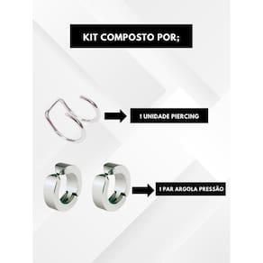 Kit brinco argola pressão prata piercing cartilagem encaixe garra aço inox - 3 peças Kit brinco argola pressão prata piercing cartilagem encaixe garra aço inox - 3 peças Kit brinco na cor aço inox prata é uma ótima opção para presentear um amigo ou namorado. Esse kit é bem completo, pois contém 1 peça do brinco de cartilagem e 2 peças 1 par do brinco pressão argola. Não precisa ter furo para usar - preço do kit com 3 peças - excelente qualidade ============================================== Fotos reais do produto na galeria Detalhes técnicos: Marca: visujóias Modelo: brinco pressão kit Diâmetro: 8mm Espessura do brinco: 4mm Incluso: 3 peças 2 peças 1 par de argola pressão e 1 peças brinco cartilagem . Material: aço inoxidável. Código do produto sku : 3093-2-3495-prata : a tem prazo de 6 meses. Todas as peças possuem tratamento antialérgico. ============================================== P:minha compra é segura R:toda compra que é feita aqui está em ambiente seguro, isso significa que se caso ocorra algum imprevisto faremos o estorno de seu pagamento. R: sim. P: precisa de furo para usar O brinco fica caindo R: não não precisa de furo para usar. Colocando o brinco da maneira correta, não fica caindo, pelo contrario, fica bem fixo. Temos um vídeo na galeria explicando como usar. P: produto é a prova d'água R: sim, pode usar em piscinas e praias que não escurece. P: tem R: sim, todos os nossos produtos tem de 6 meses, contra defeitos de fabricação. Todas as informações de cuidados são enviados junto com o produto. P: posta em quanto tempo P: posso trocar se não servir R: sim, enviamos nosso contato junto com o produto para orientação sobre troca. P: posso devolver se não gostar R: sim, caso não goste do produto é só entrar em contato conosco que iremos orientá-lo como efetuar a devolução. Dúvidas Pergunte à vontade, estamos aqui. ficaremos felizes em responder rapidamente. Aguardamos sua compra e estamos ao seu dispor : Marca: Não Informado Ean: 7732647216218