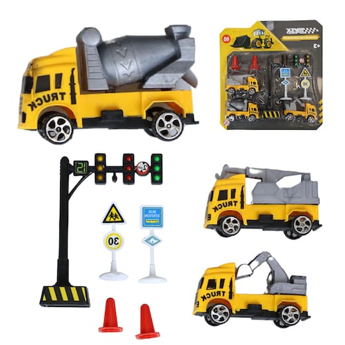 Características: - Material: Plástico; - Acima de 03 anos; - Contém: 03 caminhões e 05 acessórios; - Tamanho do caminhão: 7,5cm de comprimento x 3cm de largura x 3cm de altura.