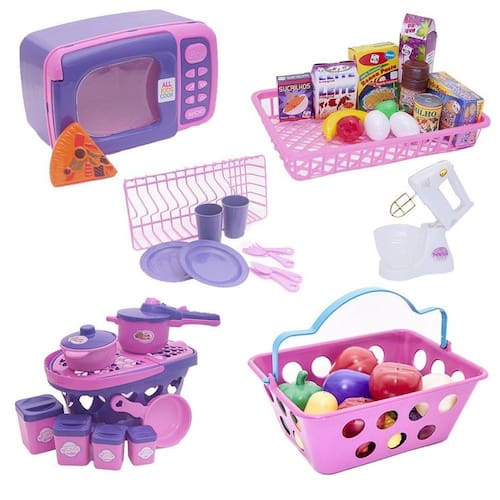 O kit vem com micro-ondas com acessório, mercadinho com frutinhas, legumes e comidinhas, jogo de panelas com cestinha e potinhos de mantimentos, escorredor com louça, batedeira