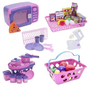 O kit vem com micro-ondas com acessório, mercadinho com frutinhas, legumes e comidinhas, jogo de panelas com cestinha e potinhos de mantimentos, escorredor com louça, batedeira