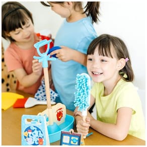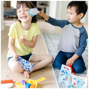 Este conjunto de limpeza de 9 peças para crianças com personagens e elementos de Blues Clues You é perfeito para transformar a hora da limpeza em uma brincadeira divertida. O kit inclui um espanador de cabeça fofa, uma escova de cerdas macias, uma pá durável, um borrifador, um pano de limpeza e uma esponja em formato de pata. Além disso, conta com uma placa de advertência dobrada e uma lista de verificação de limpeza reutilizável para melhorar a brincadeira de faz de conta. Todas as peças são armazenadas ordenadamente no transportador com cabo de madeira. O conjunto Blues Clues You promove a preparação para o jardim de infância, inspirando confiança, capacitação e gentileza em crianças em idade pré escolar à medida que desenvolvem suas habilidades sociais, de resolução de problemas e de desenvolvimento por meio de brincadeiras. Varra, tire o pó, borrife e limpe com este conjunto de jogos de limpeza infantil. É um ótimo presente para crianças em idade pré escolar, de 3 a 5 anos, para brincadeiras práticas e sem tela.