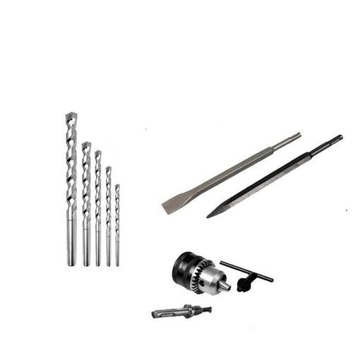 Kit para martelete com brocas de encaixe simples + mandril e adaptador + ponteiro e talhadeira Kit para martelete contendo brocas de vídea com encaixe simples, ponteiro, talhadeira, mandril e adaptador Este kit é ideal para você que trabalha com martelete, pois ele é composto pelos acessórios necessários em uma obra. É uma ótima oportunidade, pois esse kit já te oferece os acessórios mais utilizados em uma obra. Obs: o encaixe das brocas é simples, não é sds plus. Dados técnicos: Material: metal; Mandril: 1/2; Adaptador de mandril: sds para mandril de 1/2; Ponteiro: 250mm Talhadeira: 250mm Itens que acompanham o kit: -01 talhadeira marca disponível no momento da compra ; -01 ponteiro marca disponível no momento da compra ; -01 jogo com 05 brocas de vídea com encaixe simples marca disponível no momento da compra ; -mandril marca disponível no momento do pedido , não pode ser com impacto do martelete, pois não aguenta ; -adaptador sds de mandril marca disponível no momento .