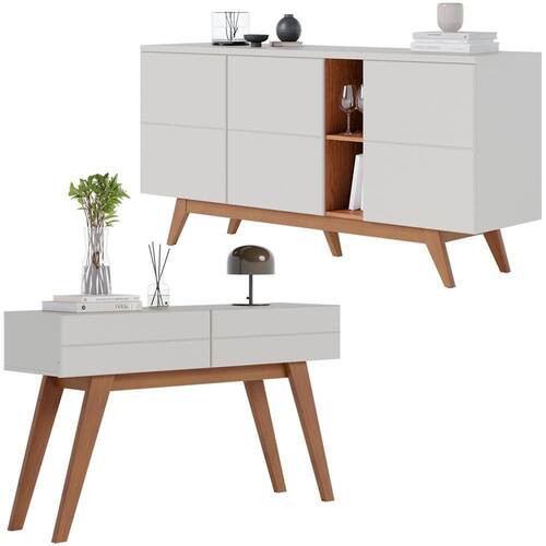 Kit Buffet E Aparador Para Sala Noronha, indicado para deixar sua sala de jantar ou estar, ainda mais moderna e sofisticada. Estrutura em MDP de 15 mm e 25 mm, proporcionando mais durabilidade e resistência à peça, contando com pintura em acabamento UV/PU (Fosco). Composto por Buffet com amplo tampo de 25 mm, ideal para servir jantares em seu lar, 3 portas com detalhes chanfrados, dobradiças metálicas, e não necessitam de puxadores, utilizam o sistema fecho toque, diferencial que agrega ainda mais elegância ao móvel, conta com divisória e prateleiras internas reforçadas, possui ainda, nichos decorativos em tom amadeirado, ótimo para decorações, e 5 pés retro em madeira maciça. Suporta até 43 kg distribuídos. Aparador composto por tampo espaçoso, 2 gavetas com corrediças telescópicas e detalhes chanfrados, e conta com pés retro em madeira maciça. Suporta até 14 kg distribuídos. Kit Buffet e Aparador Noronha, é aquele detalhe que faltava na sua decoração. Estes móveis chegarão na sua casa separado em 03 volumes.