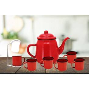 Como o kit é bem completo, ainda está incluso 6 mini canecas esmaltadas e um super Bule Esmaltad Vermelho com capacidade para 1 Litro.