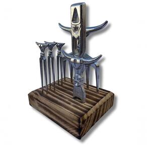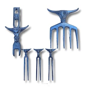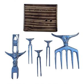 Kit Bull Garfo com 5 dentes com suporte de madeira, garfos de petiscos, garra e abridor de cerveja para transformar seus momentos, ainda mais práticos e especiais! Ótima para churrascos!