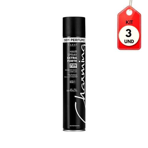 Kit C/03 Charming Black Hair Spray S/ Perfume 400ml DESCRIÇÃO: O Charming Spray Black Fix possui jato seco, sem fragrância. Estiliza, modela e fixa os cabelos, finalizando os penteados e permitindo criar os mais diversos estilos.AÇÃO/ATIVOS: Oferece fixação instantânea e proporciona ação duradoura até em ambientes mais úmidos, mantendo o penteado bonito na hora que você mais precisa.MODO DE USAR: Vaporize a superfície dos cabelos com leves jatos de modo contínuo e uniforme, a uma distância de aproximadamente 20 centímetros. Para modelar mechas ou velorizar franjas, aplique de forma mais concentradas. Modele utilizando as pontas dos dedos, criando o efeito desejado. Para retirar o produto dos cabelos, basta escovar ou lavar os cabelos normalmente. Secagem rápida e anti-umidade.ESTE ANÚNCIO CONTÉM: 03 Charming Black Hair Spray S/ Perfume 400mlKit C/03 Charming Black Hair Spray S/ Perfume 400ml