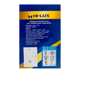 ESPECIFICAÇÕES - Índice de proteção: IP20 - Tensão: Bivolt Automático 100V - 240V - Ângulo de abertura: 220º - IRC**: >80 - Vida útil: 25.000 horas - Potência: 20W - Fluxo luminoso: 1600 lumens - Base: E27 - Temperatura de cor: 6500K (Branca) - Eficiência luminosa: 80lm/W -Dimensão (mm): 120mm x 80mm - Equivalência: Incandescente 100W / Fluorescente 29W