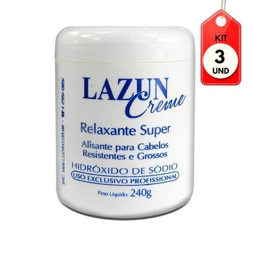 Kit C/03 Lazun Creme Alisante E Relaxante Super 240g DESCRIÇÃO:Creme alisante para cabelos resistentes e grossosAÇÃO/ATIVOS:Creme alisante relaxante super com hidróxido de sódioMODO DE USAR:Aplique rapidamente por todo o comprimento do cabelo, apoiando-as sobre as mãos, deixe o creme alisante agir por 5 minutos, sem pentear, após o tempo de amolecimento dos fios, alinhe as mechas delicadamente, com auxílio do pente de dentes finos, no mesmo sentido do nascimento dos fios, evitando dobrá-losESTE ANÚNCIO CONTÉM: 03 UNIDADES DE LAZUN CREME ALISANTE E RELAXANTE SUPER 240GKit C/03 Lazun Creme Alisante e Relaxante Super 240g