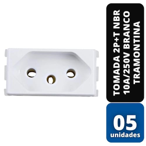 **KIT ECLUSIVO COM 05 UNIDADES**Tomada 2P+T NBR 10A/250V Branco - TRAMONTINAO Módulo Tomada 2P+T Tramontina 10 A 250 V Branco é versátil e muito prático. Produzido em termoplástico antichama, ele possui 2P+T e 10 A, além de apresentar 250 V. Na cor branca, pode ser substituído por outras cores presentes na linha, assim como ser utilizado com outras placas de diferentes linhas da Tramontina. Possui ainda acabamento brilho que não retém poeira. É um modelo largo que garante um contato perfeito com a rede elétrica, já que os condutores elétricos são fixados aos bornes e travados por parafusos. Uma peça prática e essencial para deixar seu projeto ainda melhor!*Utilizar nas linhas: Liz, Lux², Giz, Tablet, Lizflex, Plastibox e conduletes Tramontina com tampa sistema modular.*Comprimento: 40 mm*Largura: 20 mm*Altura: 35 mm*Conteúdo da embalagem: 1 Unidade de Tomada*Ref.: TRAMONTINA- 57115030* Imagens meramente ilustrativas**Codigo: KIT-80515-05*Marca: Tramontina