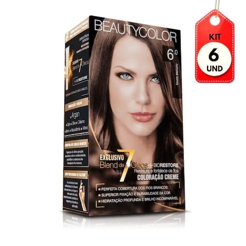 Kit C/06 Beautycolor Tinta Kit 6.0 Louro Escuro DESCRIÇÃO: A Coloração Creme Permanente 6.0 Louro Escuro Beauty Color restaura e fortalece os fios, promove uma perfeita cobertura dos fios brancos, superior fixação e durabilidade da cor. Uniformiza e intensifica a cor e o brilho quando o cabelo se encontra desbotado e sem brilho, promovendo Hidratação profunda e brilho incomparável. O kit contém: coloração, Emulsão, luva profissional, sache de tratamento e gota mágica.AÇÃO/ATIVOS: Fórmula enriquecida com Exclusivo Blend de 7 Óleos e BIORESTORE : complexo de aminoácidos essenciais + nutrientes. Garante força, resistência e potencializa a hidratação e brilho dos cabelos garantindo fixação, longa duração da cores e reparação dos fios.MODO DE USAR: Sugestão de Aplicação: 1-Prepare a mistura; 2-Proteja os ombros com uma toalha e a pele com um gel ou creme hidratante; 3-Com a ponta do frasco aplicador, separe pequenas mechas do cabelo e vá aplicando o produto pela raiz, comprimento e pontas; 4-Em seguida, massageie suavemente os cabelos até que o produto esteja distribuído uniformemente; 5-Deixe agir por 20 minutos. Não utilize touca nem prenda o cabelo durante o tempo de ação do produto; 6-Terminando o tempo de ação, enxágue bem até que a água saia limpa. Não é necessária a aplicação de shampoo; 7-Aplique o Creme de Hidratação Profunda Pós Coloração BEAUTYCOLOR, massageie e deixe agir por alguns minutos; 8-Enxágue. Aplique a Gota Intensificadora de Brilho BEAUTYCOLOR, esfregue uma pequena quantidade na palma das mãos e aplique suavemente nos cabelos úmidos ou secos, concentrando o produto nas pontas. Não enxágue.ESTE ANÚNCIO CONTÉM: 06 Beautycolor Tinta Kit 6.0 Louro EscuroKit C/06 Beautycolor Tinta Kit 6.0 Louro Escuro
