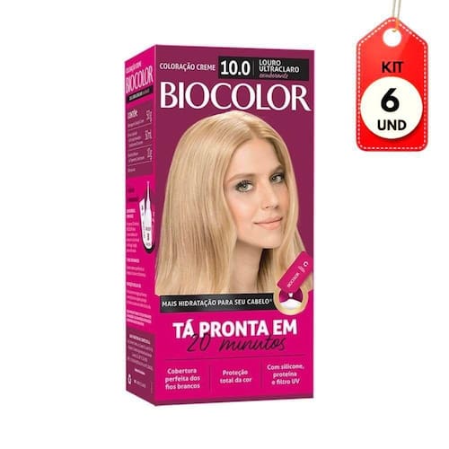 Kit C/06 Biocolor 10.0 Louro Exuberante Mini Kit DESCRIÇÃO:Tintura Mini 10.0 Louro Exuberante Biocolor é ideal para quem deseja colorir os cabelos de maneira simples, rápida e prática.AÇÃO/ATIVOS:Age em apenas 20 minutos e tem fragrância suave devido à uma tecnologia que reduz o cheiro da amônia, tornando a aplicação muito mais agradável. Inclui no kit uma loção reveladora, a coloração e o tratamento condicionante para uma semana. Imagem meramente ilustrativa. O produto pode ter variação de cor ou desenho, porém as características gerais são as mesmas especificadas na descrição do produto. MODO DE USAR:Coloque as luvas. Divida o cabelo em 4 partes. Separe pequenas mechas. Inicie a aplicação pela frente, siga para trás e depois para as pontas, distribua o produto de maneira uniforme até que todo o cabelo esteja coberto pela coloração. Deixe agir por 20 minutos. Enxágue abundantemente até que a água fique totalmente transparente, lave os cabelos com shampoo. Aplique a máscara em todo o comprimento dos cabelos, massageie e deixe agir por 3 minutos. Enxágue e finalize como desejar.ESTE ANÚNCIO CONTÉM: 06 UNIDADES DE BIOCOLOR 10.0 LOURO EXUBERANTE MINI KITKit C/06 Biocolor 10.0 Louro Exuberante Mini Kit