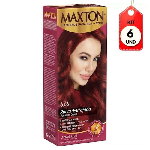 Kit C/06 Maxton Tinta 6.66 Vermelho Cereja DESCRIÇÃO: A fórmula da tinta de cabelo creme Maxton tem qualidade profissional porque foi desenvolvida utilizando-se um mix equilibrado de moléculas especiais. Este poderoso equilíbrio proporciona tons luminosos e uma cobertura perfeita dos fios brancos. Contém uma exclusiva combinação de polímeros de alto e baixo peso molecular que permitem uma maior aderência e total afinidade do produto aos fios e, como resultado, uma uniformidade da cor da raiz às pontas.AÇÃO/ATIVOS: Queratina, ceramidas e silicone.MODO DE USAR: Modo de usar, prova de toque, demais advertências e restrições de uso estão presentes na embalagem interna do cartucho.ESTE ANÚNCIO CONTÉM: 06 Maxton Tinta 6.66 Vermelho CerejaKit C/06 Maxton Tinta 6.66 Vermelho Cereja