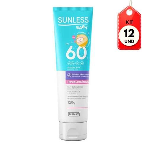 Kit C/12 Farmax Sunless Baby Fps 60 Protetor Solar 120g DESCRIÇÃO: Sunless Baby oferece proteção muito alta contra os rios UVA e UVB e é indicado para pele extremamente sensível à queimadura solar. AÇÃO/ATIVOS: Sua fórmula é suave e delicada, especial para a pele sensível do bebê. Possui toque seco e é um forte aliado no combate à formação de radicais livres, prevenindo o envelhecimento precoce da pele ocasionado pela exposição excessiva ao sol. Resistente à água e suor. Livre de parabenos. Com vitamina E. Oil free. Hipoalergênico (formulado de maneira a minimizar o possível surgimento de alergia). MODO DE USAR: Aplique abundantemente 15 a 30 minutos antes de exposição ao sol e sempre que necessário. Para melhor eficácia, reaplicar sempre, após sudorese intensa, nadar ou banhar-se, secar-se com toalha e durante a exposição ao sol. ESTE KIT CONTÉM: 12 UNIDADES DE Farmax Sunless Baby FPS 60 Protetor Solar 120gKit C/12 Farmax Sunless Baby Fps 60 Protetor Solar 120g