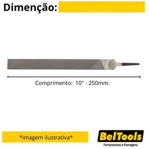 Descrição: Possui picado duplo e corte grosso que proporciona maior desbaste. Indicação: Indicada para desbastar metais em superfícies planas. Dureza: 58-62 HRC. Comprimento: 10" - 250mm. Cabo: Não. Perfil: Chata. Tipo de picado: Picado duplo - BASTARDA.