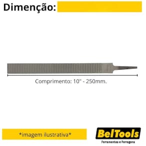 Descrição: Possui um dos lados chato e outro arredondado possibilitando utilização em superfícies côncavas ou planas. Indicação: Indicada para desbaste de madeira em superfícies planas ou côncavas. Comprimento: 10" - 250mm. Cabo: Sem cabo. Perfil: Chata