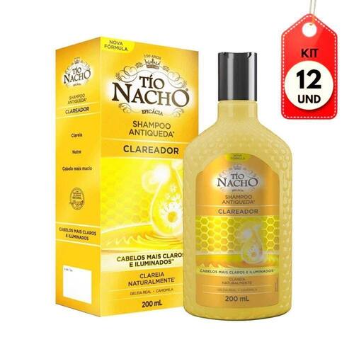 Kit C/12 Tio Nacho Shampoo Antiqueda Clareador 200ml DESCRIÇÃO:Shampoo Antiqueda e Clareador Tio Nacho possui em sua fórmula extratos naturais, tais como a Camomila e a geleia real. Nutre e deixa os fios de cabelo mais resistentes aos danos.AÇÃO/ATIVOS:Sua fórmula possui propriedade que elimina o excesso de oleosidade, hidrata e fortalece os fios, oxigenando também o couro cabeludo. É rico em Vitamina E, um potente antioxidante. Imagem meramente ilustrativa. O produto pode ter variação de cor ou desenho, porém as características gerais são as mesmas especificadas na descrição do produto.MODO DE USAR:Aplique o produto sobre o cabelo molhado distribuindo generosamente, fazendo uma leve massagem no couro cabeludo. Enxágue.ESTE ANÚNCIO CONTÉM: 12 UNIDADES DE TIO NACHO SHAMPOO ANTIQUEDA CLAREADOR 200MLKit C/12 Tio Nacho Shampoo Antiqueda Clareador 200ml