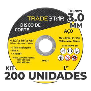 Kit c/ 200 Unidades Disco de Corte Metal 115x3,0 mm Furo 22/23 mm O Disco de Corte Metal 115x3,0 mm com Furo 22/23 mm, a escolha definitiva para profissionais que buscam potência e durabilidade no corte de metais. Com um diâmetro de 115mm e uma espessura de 3,0mm, este disco oferece cortes precisos e eficientes em uma ampla variedade de materiais metálicos. Principais Características e Aplicações: Corte Eficiente: Execute cortes rápidos e precisos em metais diversos, desde ferro até aço resistente. Indústria e Construção: Indispensável para projetos industriais, construção civil e manutenção. Como Obter Resultados Excepcionais: Preparação Adequada: Assegure que o material esteja firmemente fixado e seguro antes de iniciar o corte. Ferramenta Apropriada: Utilize o disco em uma esmerilhadeira angular com o furo de tamanho compatível. Movimentos Controlados: Mantenha a esmerilhadeira em um ângulo adequado e faça movimentos suaves para um corte uniforme. Benefício Central do Disco de Corte Metal: Potência e Durabilidade: O Disco de Corte Metal 115x3,0 mm com Furo 22/23 mm é a ferramenta essencial para profissionais que buscam cortes precisos e eficientes, garantindo resultados excepcionais em cada projeto. Disco De Corte Para Aços » Indicado Para Corte De Aços. » 2 Telas/Reforçado. Tamanho: 4.1/2"(115 Mm) Espessura: 3,0 Mm Furo: 22,23 Mm Quantidade por embalagem – 200 unidades