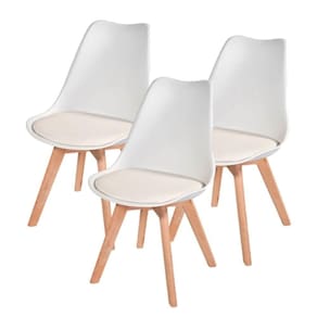 Kit C| 3 Cadeira Leda Branca - Charles Eames Wood Com Almofada Cadeira Leda Charles Eames Wood Do designer finlandes Eero Saarinen, a cadeira com assento estofado Saarinen representa um trabalho icônico de design da década de 50, juntamente com a Eames. Sua concha ergonômica é produzida em PP (Polipropileno) e conta com assento fixo em tecido sintetico (PU). Seus pés são feitos em madeira com ótimo acabamento. Adequa-se perfeitamente para compor conjunto de mesa de jantar ou qualquer outro ambiente em sua casa ou escritório. Ideal para receber amigos e familiares com um toque de elegância e charme.