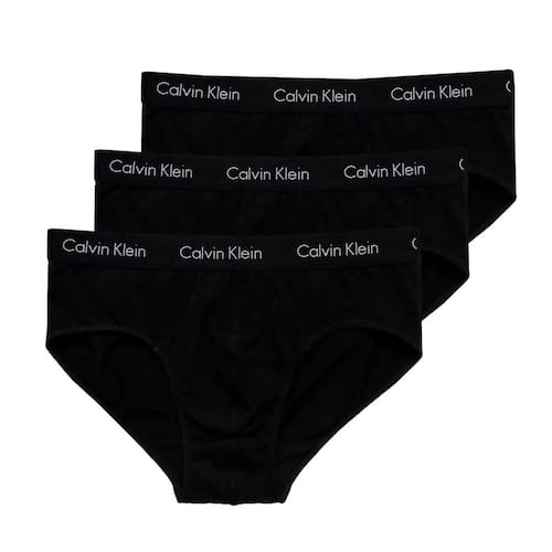 Kit contendo 3 unidades de cuecas Calvin Klein modelo Brief (Slip) confeccionadas em 95% Algodão e com elástico aparente personalizado de 35 milímetros.