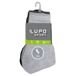 Kit contendo 3 pares de meia esportiva Lupo atoalhadas de cano médio e com calcanhar verdadeiro. O tamanho M tem cano de 12 cm de altura e o tamanho G tem 14 cm de altura.