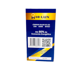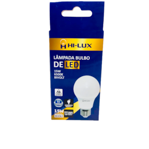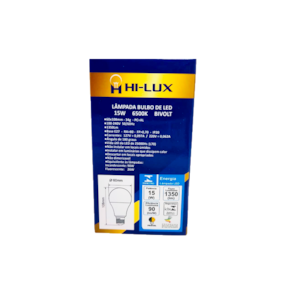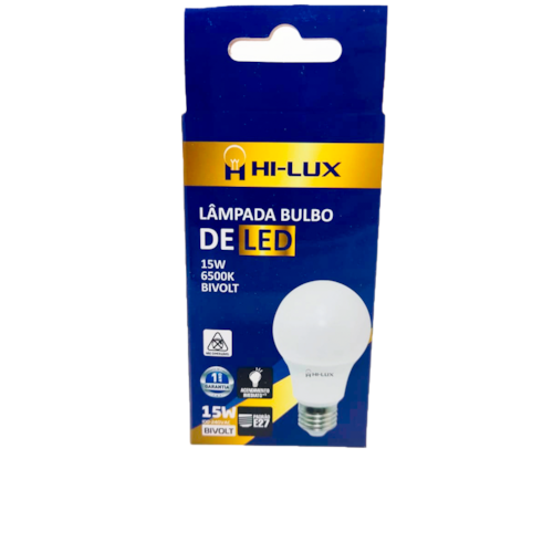 ¿ Base : E27 ¿ Tensão : Bivolt Automático 100V - 240V ¿ Ângulo de abertura : 180 graus ¿ Potência : 15W ¿ Fluxo Luminoso : 1350 Lumens ¿ Temperatura de cor : 6500K ¿ Emissão de cor : Branca ¿ Equivalência : Incandescente 75w / Fluorescente 20W ¿ Dimensões : 108mm x 60mm... Marca: HI-LUX LED