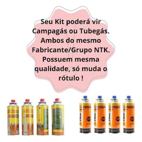 Kit c/4 refil + maçarico portátil com regulagem gourmet2 Kit maçarico + 4 refis campgas Campgás cartucho refil gás butano fp ntk nautika é amplamente utilizado em fogareiros para camping, como uma ao gás de cozinha tradicional, sendo compatível com maçarico ikon e maxtop e fogareiros frontier, magus, duo ceramik e cheff. - segurança: o campgás é equipado com o sistema de segurança max crv butane, uma tecnologia ante explosão que garante a segurança do usuário. com uma válvula de segurança que permite o engate e desengate, de forma que os vazamentos sejam evitados. - características: o excelente desempenho e durabilidade, com a nova composição química do campgás é uma mistura de iso-butano 34%, nor-butano: 63%, propano 3%. Sendo essa uma composição de gás mais pura e de maior qualidade. essa nova fórmula gera um maior desempenho calórico, economia e segurança, garantindo mais autonomia em variações de temperatura e maior durabilidade. Especificações técnicas: - marca: nautika - kit 4 unidades - maçarico suporta 1300ºc Composição: - propano 6% - nor-butano 60% - iso- butano 34% - peso líquido: 227g Acompanha: - 01 maçarico automático 1300ºc - 04 refis campgás. Marca: Não Informado