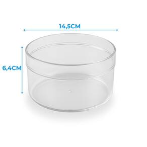 Altura com tampa: 6,6cm Altura sem tampa: 6,4cm Diametro com a tampa: 15cm Diametro sem a tampa: 14,6cm Peso: 0,112kg Capacidade: 950ml Material: Poliestireno/ Não tóxico