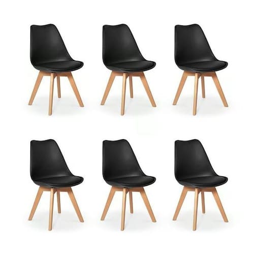 Kit C/6 Cadeiras Leda Charles Eames, Saarinen Wood Com Almofada Preta Cadeira Leda Charles Eames Wood Do designer finlandes Eero Saarinen, a cadeira com assento estofado Saarinen representa um trabalho icônico de design da década de 50, juntamente com a Eames. Sua concha ergonômica é produzida em PP (Polipropileno) e conta com assento fixo em tecido sintetico (PU). Seus pés são feitos em madeira com ótimo acabamento. Adequa-se perfeitamente para compor conjunto de mesa de jantar ou qualquer outro ambiente em sua casa ou escritório. Ideal para receber amigos e familiares com um toque de elegância e charme.