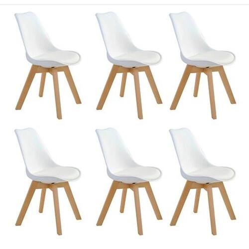 Kit C/ 6 Cadeiras Leda Charles Eames, Saarinen Wood Com Almofada Branca Cadeira Leda Charles Eames Wood Do designer finlandes Eero Saarinen, a cadeira com assento estofado Saarinen representa um trabalho icônico de design da década de 50, juntamente com a Eames. Sua concha ergonômica é produzida em PP (Polipropileno) e conta com assento fixo em tecido sintetico (PU). Seus pés são feitos em madeira com ótimo acabamento. Adequa-se perfeitamente para compor conjunto de mesa de jantar ou qualquer outro ambiente em sua casa ou escritório. Ideal para receber amigos e familiares com um toque de elegância e charme.