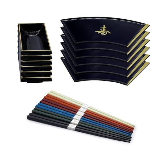 Kit C/6 Prato Leque 6 Molheira 6 Hashi Sushi Sashimi - Preto