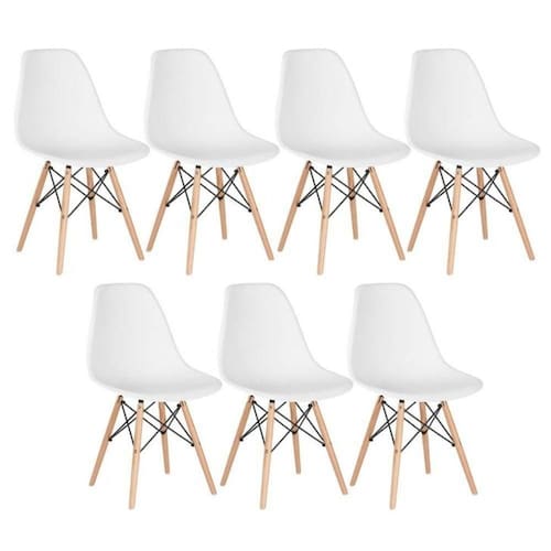 Kit C/ 7 Cadeira Charles Eames Eiffel Dkr Wood Cozinha Jantar Branca Cadeira Eiffel Eames Base Madeira A CADEIRA CHARLES EAMES EIFFEL foi criada nos anos 50, é vencedora do Museu de Nova York da concorrência Design de Mobiliário Low-Cost Arte Moderna Internacional. Sua base é em MADEIRA no formato de uma torre faz com que o ambiente não fique sobrecarregado. Adequa-se perfeitamente para compor conjunto de mesa de jantar ou qualquer outro ambiente em sua casa ou escritório. Ideal para receber amigos e familiares com um toque de elegância e charme. As pernas da cadeira são em madeira e fios de aço preto no qual garantem estabilidade à cadeira.