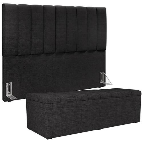 Kit Cabeceira Cama Box Casal 140cm Com Calçadeira Recamier Baú Dália W01 Linho Chumbo - Lyam Decor