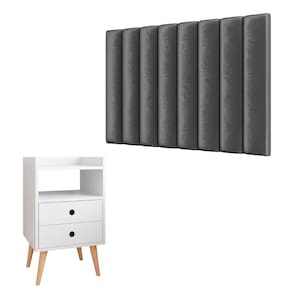 Kit Cabeceira Estofada Cama Box Solteiro 90 cm Sophia Cinza e Mesinha Canto Quarto 2 Gavetas Retrô Nicho Decorativo Dream Branco- RPM