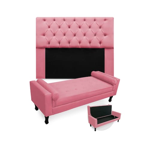 Kit Cabeceira Estofada Mirage E Recamier Baú Fenix King 195 cm Suede Rosa Barbie - LM DECOR