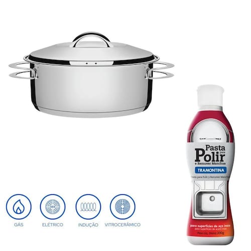 O Kit Caçarola Rasa Solar 20 cm + Pasta para Polir Tramontina é a combinação perfeita para quem busca praticidade, qualidade e durabilidade na cozinha. A caçarola da linha Solar é fabricada em aço inox com fundo triplo aço inox + alumínio + aço inox , garantindo aquecimento uniforme e rápido, evitando que os alimentos queimem em pontos isolados. Com 20 cm de diâmetro e capacidade de 2,9 litros, ela é ideal para preparar diferentes receitas no dia a dia, desde molhos até refeições mais elaboradas. Seu design moderno e acabamento polido conferem elegância, além de ser compatível com fogões a gás, elétrico, vitrocerâmico e indução. Também pode ser levada ao forno até 260 C e à máquina de lavar louças, facilitando a rotina. O kit acompanha uma pasta para polir inox Tramontina, desenvolvida especialmente para restaurar o brilho natural do aço inoxidável, removendo manchas e marcas de uso, garantindo que sua panela esteja sempre com aparência de nova.