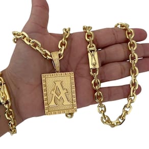Kit Cadeado 8mm + Pingente Letra Banhado a Ouro 18K Detalhes do Produto: Material: ligas metálicas de alta qualidade, especialmente tratadas para fixação e absorção do ouro, com acabamento em verniz protetor. Aparência: visual idêntico ao ouro maciço. Produção: artesanal, com atenção meticulosa aos detalhes. Banho: 10 camadas espessas de ouro 18k, finalizadas com verniz antialérgico . Elos: soldados varia conforme o modelo . Pedras: zircônias brilhantes cravejadas quando aplicável . Tamanhos Disponíveis: Cordões Masculinos: 70cm padrão e 60cm sob consulta/Pedido Via Chat . Cordões Femininos: 50cm padrão e 45cm sob consulta/Pedido Via Chat . Pulseiras: 21cm padrão ; tamanhos de 18cm a 23cm sob consulta/Pedido Via Chat. Pingentes: conforme imagens; consulte para mais detalhes via chat. Espessuras Recomendadas para Cordões / Pingentes: P: 1mm a 4mm M: 4mm a 8mm G: 6mm a 13mm Gg: 12mm a 18mm Incluso na Compra: Saquinho de organza para armazenamento seguro. Caixa elegante, perfeita para presente. Cupom de desconto para a próxima compra. Flyer com outros produtos da coleção. Carta de agradecimento personalizada. Adesivo da marca ToJoia18k. Informações Adicionais: : 6 meses termos acompanham o produto . Devolução: 7 dias para devolução sem questionamentos. Envio: despacho em até 24 horas úteis após confirmação do pagamento. Cuidados com a Peça: Evite contato com produtos químicos; aguarde o perfume secar antes de usar. Evite contato com shampoo, condicionadores e suor excessivo. Armazene em local seco, preferencialmente no saquinho de organza fornecido. Uso no mar e piscina é permitido; lave com água corrente e sabão neutro após. Por que Escolher a ToJoia18k Semi-joias luxuosas que combinam estilo, qualidade e sofisticação. Banho espesso de ouro 18k, garantindo brilho duradouro e acabamento impecável. Design exclusivo e produção artesanal, perfeitos para qualquer ocasião. Materiais premium que asseguram durabilidade. Ao escolher uma semi-joia ToJoia18k, você investe em qualidade, elegância e uma experiência única. Aguardamos sua compra Observação: pode ocorrer variação no fecho raramente . Imagens reais, sem edição. Qualquer dúvida, estamos à disposição para esclarecimentos. Marca: Não Informado