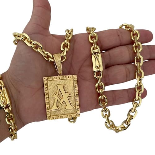 Kit Cadeado 8mm + Pingente Letra Banhado a Ouro 18K Detalhes do Produto: Material: ligas metálicas de alta qualidade, especialmente tratadas para fixação e absorção do ouro, com acabamento em verniz protetor. Aparência: visual idêntico ao ouro maciço. Produção: artesanal, com atenção meticulosa aos detalhes. Banho: 10 camadas espessas de ouro 18k, finalizadas com verniz antialérgico . Elos: soldados varia conforme o modelo . Pedras: zircônias brilhantes cravejadas quando aplicável . Tamanhos Disponíveis: Cordões Masculinos: 70cm padrão e 60cm sob consulta/Pedido Via Chat . Cordões Femininos: 50cm padrão e 45cm sob consulta/Pedido Via Chat . Pulseiras: 21cm padrão ; tamanhos de 18cm a 23cm sob consulta/Pedido Via Chat. Pingentes: conforme imagens; consulte para mais detalhes via chat. Espessuras Recomendadas para Cordões / Pingentes: P: 1mm a 4mm M: 4mm a 8mm G: 6mm a 13mm Gg: 12mm a 18mm Incluso na Compra: Saquinho de organza para armazenamento seguro. Caixa elegante, perfeita para presente. Cupom de desconto para a próxima compra. Flyer com outros produtos da coleção. Carta de agradecimento personalizada. Adesivo da marca ToJoia18k. Informações Adicionais: : 6 meses termos acompanham o produto . Devolução: 7 dias para devolução sem questionamentos. Envio: despacho em até 24 horas úteis após confirmação do pagamento. Cuidados com a Peça: Evite contato com produtos químicos; aguarde o perfume secar antes de usar. Evite contato com shampoo, condicionadores e suor excessivo. Armazene em local seco, preferencialmente no saquinho de organza fornecido. Uso no mar e piscina é permitido; lave com água corrente e sabão neutro após. Por que Escolher a ToJoia18k Semi-joias luxuosas que combinam estilo, qualidade e sofisticação. Banho espesso de ouro 18k, garantindo brilho duradouro e acabamento impecável. Design exclusivo e produção artesanal, perfeitos para qualquer ocasião. Materiais premium que asseguram durabilidade. Ao escolher uma semi-joia ToJoia18k, você investe em qualidade, elegância e uma experiência única. Aguardamos sua compra Observação: pode ocorrer variação no fecho raramente . Imagens reais, sem edição. Qualquer dúvida, estamos à disposição para esclarecimentos. Marca: Não Informado