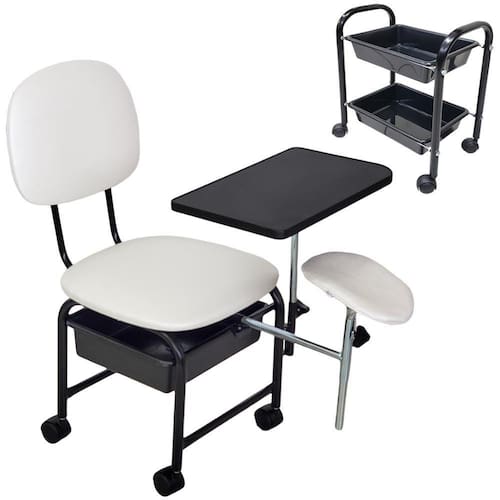 Kit de Cirandinha Manicure mais carrinho auxiliar com duas bandejasIdeal para Manicure e Pedicure, prática, compacta e resistente, seu espaço merece este confortoEste Kit compõe:1 Cirandinha Manicure1 Carrinho auxiliarMarca: For-ty Características Cirandinha:Estrutura metálica com pintura eletrostáticaEstofado em tecido Facto, o tecido Facto é resistente ao uso de Álcool 70 para limpeza e higienização. Apoio para as mãos articulável em MDF ou MDPApoio para o pé com regulagem de altura e inclinação - removível. Com regulagem de altura aproximada mínima de 52 e máxima de 69cm Gaveta em plástico reforçado, feita com matéria prima virgem - não é reciclado.A altura do assento ao chão é de 40 centímetros.Espumas do encosto e Assento dom Densidade 23Dimensões do assento: 3 alt x 40,5 larg x 43,5cm comp Dimensões do encosto: 2,5 alt x 29 larg x 37cm comp Dimensões aproximadas do apoio de mão: 0,41 Larg x 0,25cm comp Suporta até 100 kgDimensões da cirandinha montada: 72 alt x 43 larg x 47cm comp Peso do produto: 8 Kg Características Carrinho Auxiliar para ManicureEstrutura metálica em tubo 3/4 - mais largo que similares no mercadoPintura EletrostáticaPossui 2 bandejas plásticas feitas com matéria prima virgem - não é recicladoPossui Rodinhas que facilitam a movimentação do produto.Peso aproximado de 2 KgDimensões do carrinho Montado: 41 alt x 22 larg x 35cm comp Dimensões da embalagem do Kit: 41 alt x 44 larg x 47cm comp Peso aproximado do Kit:10 Kg