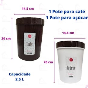 Além disso, o kit conta com dois potes, um para armazenar o café e outro para armazenar o açúcar. Os potes possuem capacidade de 2,5 litros e contam com tampas de rosca, que garantem a conservação dos alimentos por muito mais tempo.