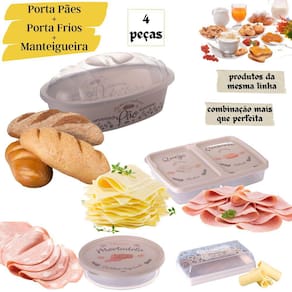 Kit Café da Manhã e Chá da Tarde para cozinha e mesa composto por 8 peças.Serve PãoMaterial: PolipropilenoDimensões: 34cm X 19,3cm X 15cm (CxLxA) Porta Frios com 2 DivisóriasMaterial: PolipropilenoDimensões: 24,2cm X 17,5cm X 4,8cm (CxLxA) Porta MortadelaMaterial: PolipropilenoDimensões: 19,2cm X 18,8cm X 5cm (CxLxA) ManteigueiraMaterial: PolipropilenoDimensões: 15,9cm X 8,5cm X 4,5cm (CxLxA)