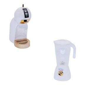 O kit vem com caixa registradora com dinheirinho e mercadinho com frutas, legumes e comidinhas, cafeteira e liquidificador, microondas, xícara com pires e colher, bulê, açucareiro, batedeira, escorredor com louça, geladeira com acessórios