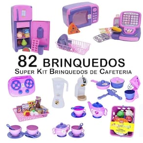 o kit vem com caixa registradora com dinheirinho e mercadinho com frutas, legumes e comidinhas, cafeteira e liquidificador, microondas, xícara com pires e colher, bulê, açucareiro, batedeira, escorredor com louça, geladeira com acessórios, jogo de panelas com acessórios