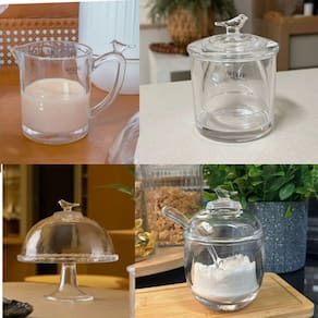 Contém: 6peças sendo: 2un Açucareiro 150ml, 1un Manteigueira 150ml, 1un Porta Guardanapo, 1un Leiteira 250ml, 1un prato com pé para bolo ou queijo com 19cm diametro e 19cm altura.