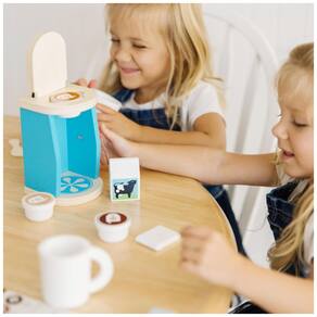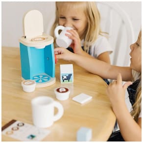 Este conjunto de café Brew Serve de madeira é perfeito para as festas de chá Pretendplay Com três cápsulas de café disponíveis normal, avelã ou mocha , as crianças podem escolher o sabor que preferirem e controlar o tamanho da porção girando o botão. Além disso, o conjunto inclui um cubo de gelo para transformar o café quente em um refrescante café gelado. O conjunto de 11 peças vem com duas canecas de madeira, creme, açúcar, uma colher e até um cartão de pedido reutilizável para baristas iniciantes. A cafeteira infantil possui tampas que abrem e fecham e mostradores que giram para indicar as configurações de tamanho, incentivando a brincadeira imaginativa e aberta. Feito de madeira durável e de alta qualidade, este conjunto de café é um ótimo presente para crianças de 3 a 6 anos. Complemente a experiência de simulação com o conjunto de fantasias de garçonete Melissa Doug e proporcione às crianças uma opção envolvente para diversão sem tela.
