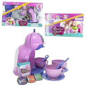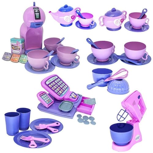 - 1 cafeteira de aproximadamente 19cm de altura x 12 cm de largura com 3 cápsulas de brinquedos - 3 tamanho da xícara : 6 cm de largura x 5 cm de altura com colher - 3 tamanho do pires : 9 cm de largura x 9 cm de altura - 1 caixinha de adoçante --------------------------------------------------------------------------------------------- - 1 tamanho do açucareiro: 11 cm de largura x 8 cm de altura - 4 xícaras : 6 cm de largura x 5 cm de altura com colher - 4 pires : 9 cm de largura x 9 cm de altura - 1 bulê: 14 cm de largura x 9 cm de altura